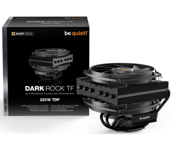 Anti-titreşim kauçuk ekler ile çift ısı lavabolar featuring, alüminyum kapaklı altı 6mm ısı boruları, iki neredeyse duyulmaz Silent Wings 135mm PWM fanlar (max. 26.7dB (A)) altı kutuplu motor ve sıvı-dinamik yatak ile, ve 220W TDP soğutma performansı, Dark Rock TF gerçek bir soğutma canavarı.